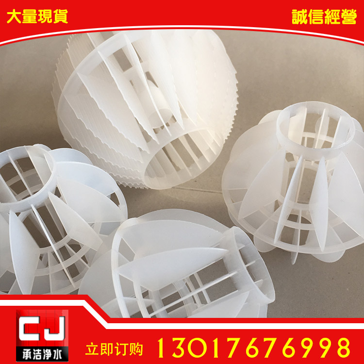 多面空心球填料,在球的中部沿整個周長有一道加固環(huán),在環(huán)的上下各有十二片球瓣。上下球瓣互相交錯,沿中心軸呈放射形布置。我廠在有關生產工程塑料的單位幫助下,總結經驗,證實多面空心球填料具有如下優(yōu)點:由于表面積大;傳質效率高,產品的球瓣與球瓣之間空間大,且重量輕、強度大、安裝方便、耐高溫(在140℃的環(huán)境中不變形),因此它在廢氣凈化、脫硫、脫二氧化碳氣體、廢水處理等行業(yè)中得到廣泛應用。