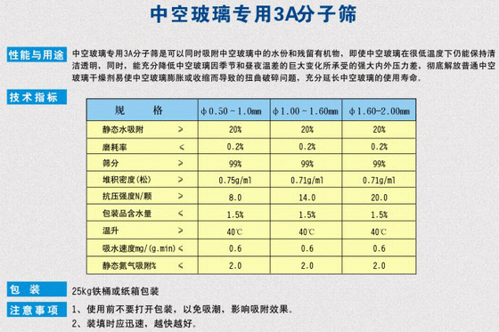 中空玻璃通用型分子篩可以同時吸附中空玻璃中的水分和殘留有機物,使中空玻璃即使在很低溫度下仍然保持光潔透明,同時,能充分降低中空玻璃因季節(jié)和晝夜溫差巨大變化所承受的強大內(nèi)外壓力差,徹底解決普通中空玻璃干燥劑易使中空玻璃膨脹或收縮而導(dǎo)致的扭曲破碎問題,充分延長中空玻璃的使用壽命。